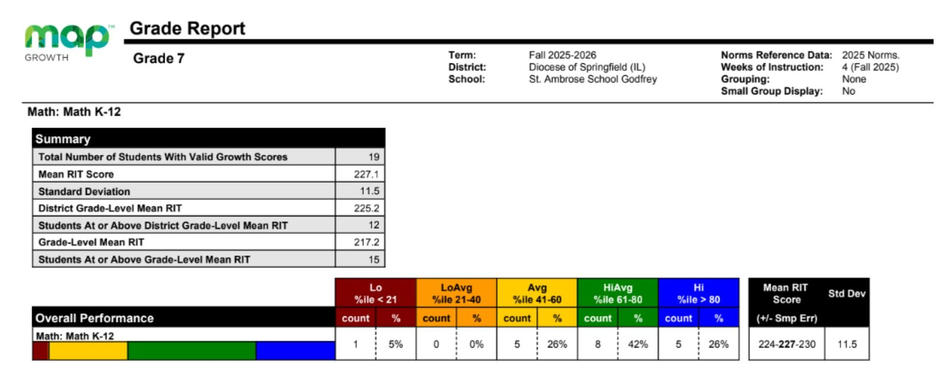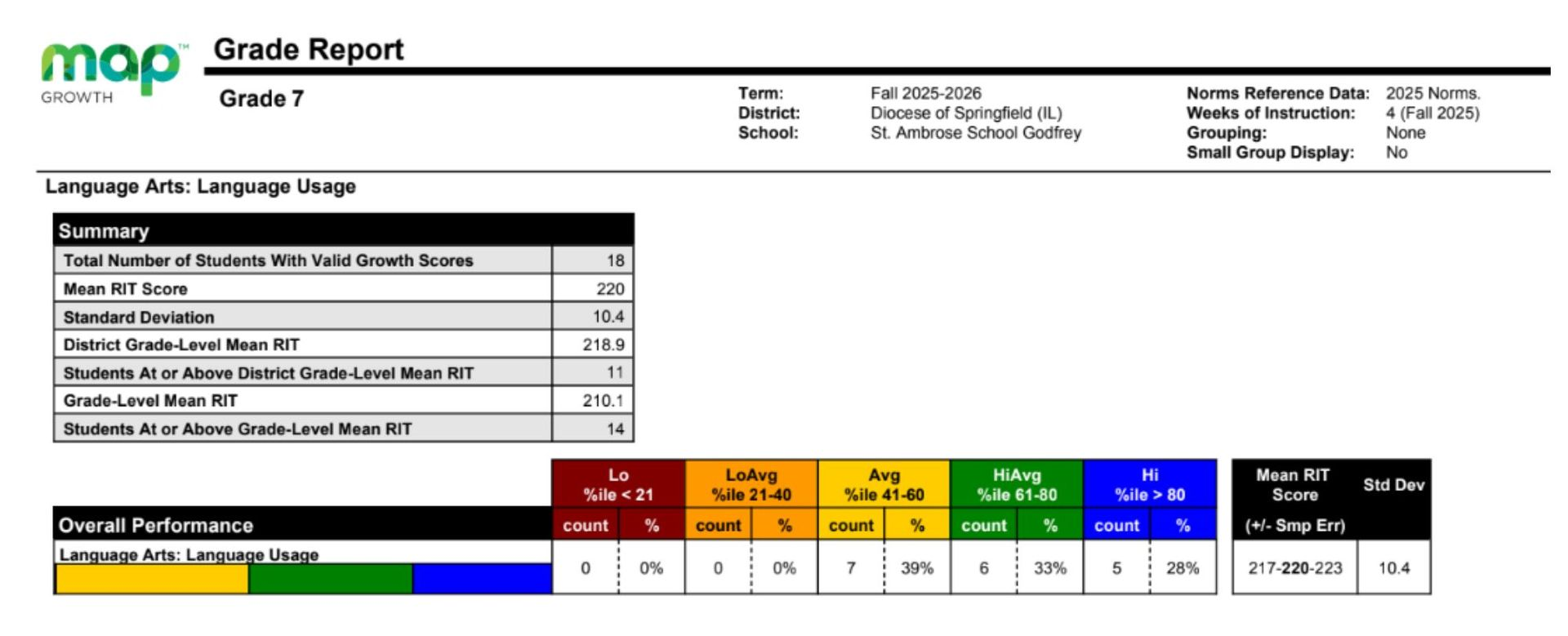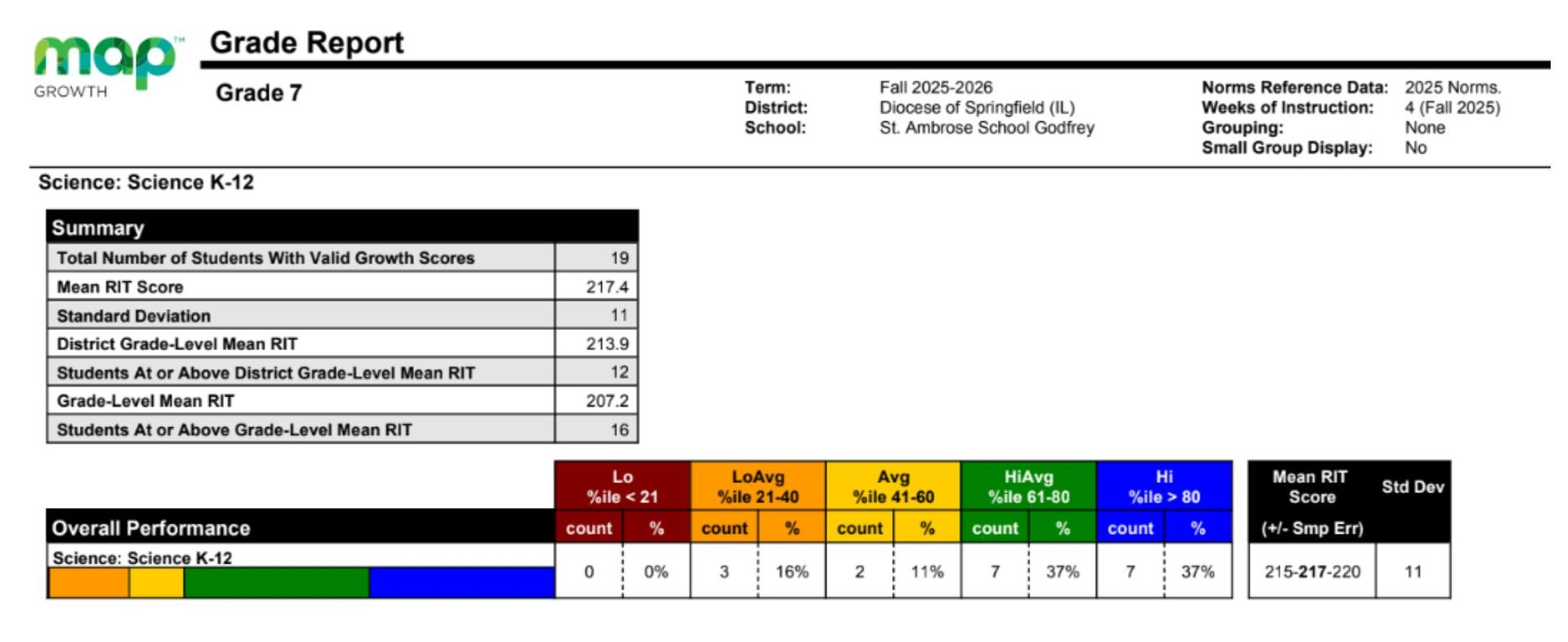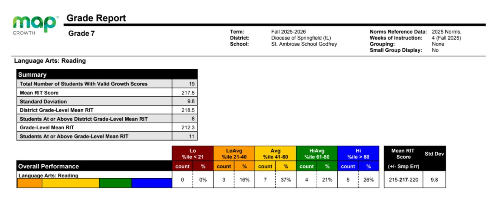 With these scores you will see a series of data points listed. The first shows the number of students that completed the test. The next score shows “Mean RIT Score,” this is our St. Ambrose average for that grade level. You will also see the “District Grade Level Mean,” this is the average score for that grade level in the Springfield Diocese. Additionally you will see the “Grade Level Mean,” this is the average for the nation.