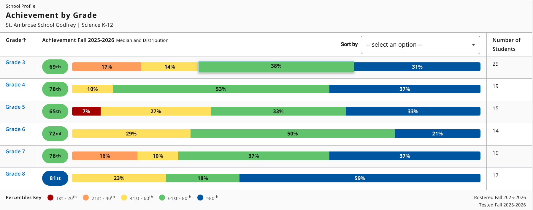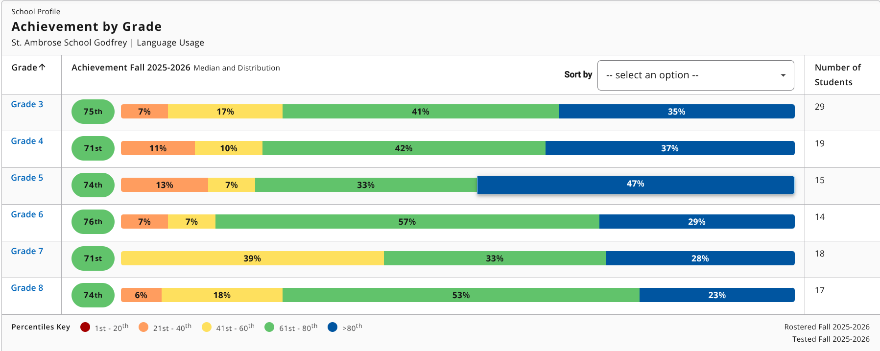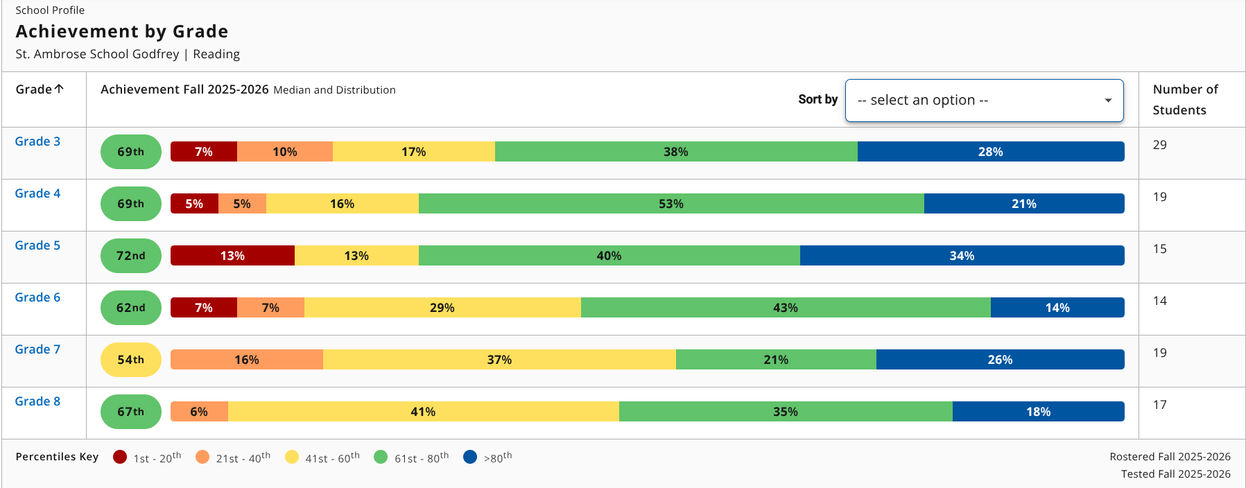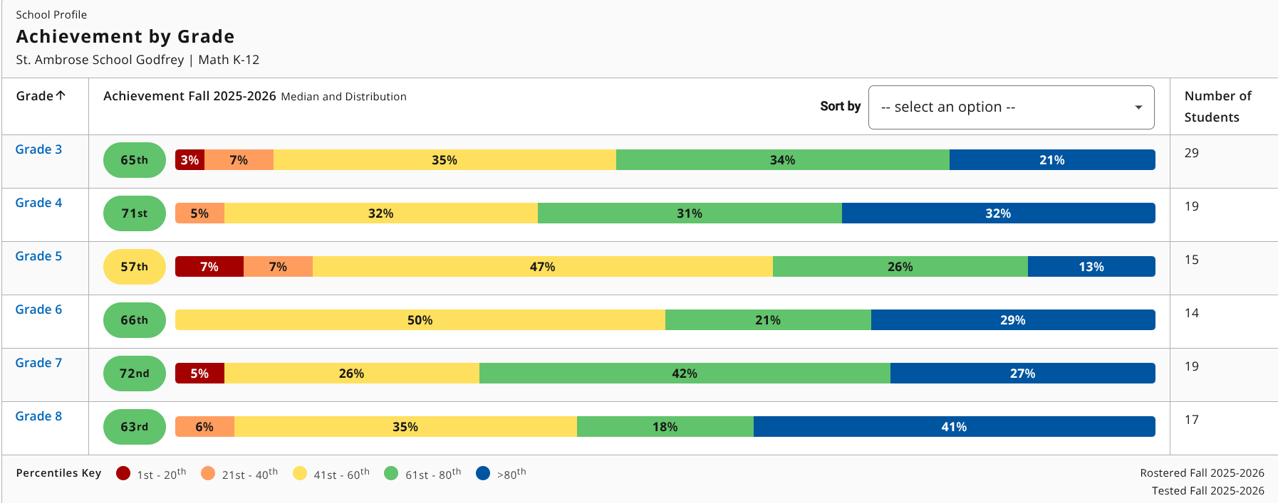Below are summaries by discipline displaying where each of our classes fell in national percentile achievement rankings for each of the 4 tests. Please remember national percentile rankings show where a class or individual is in comparison to the nation. A class or individual in the 55th percentile scored better than 54 percent of those classes or individuals that completed testing.